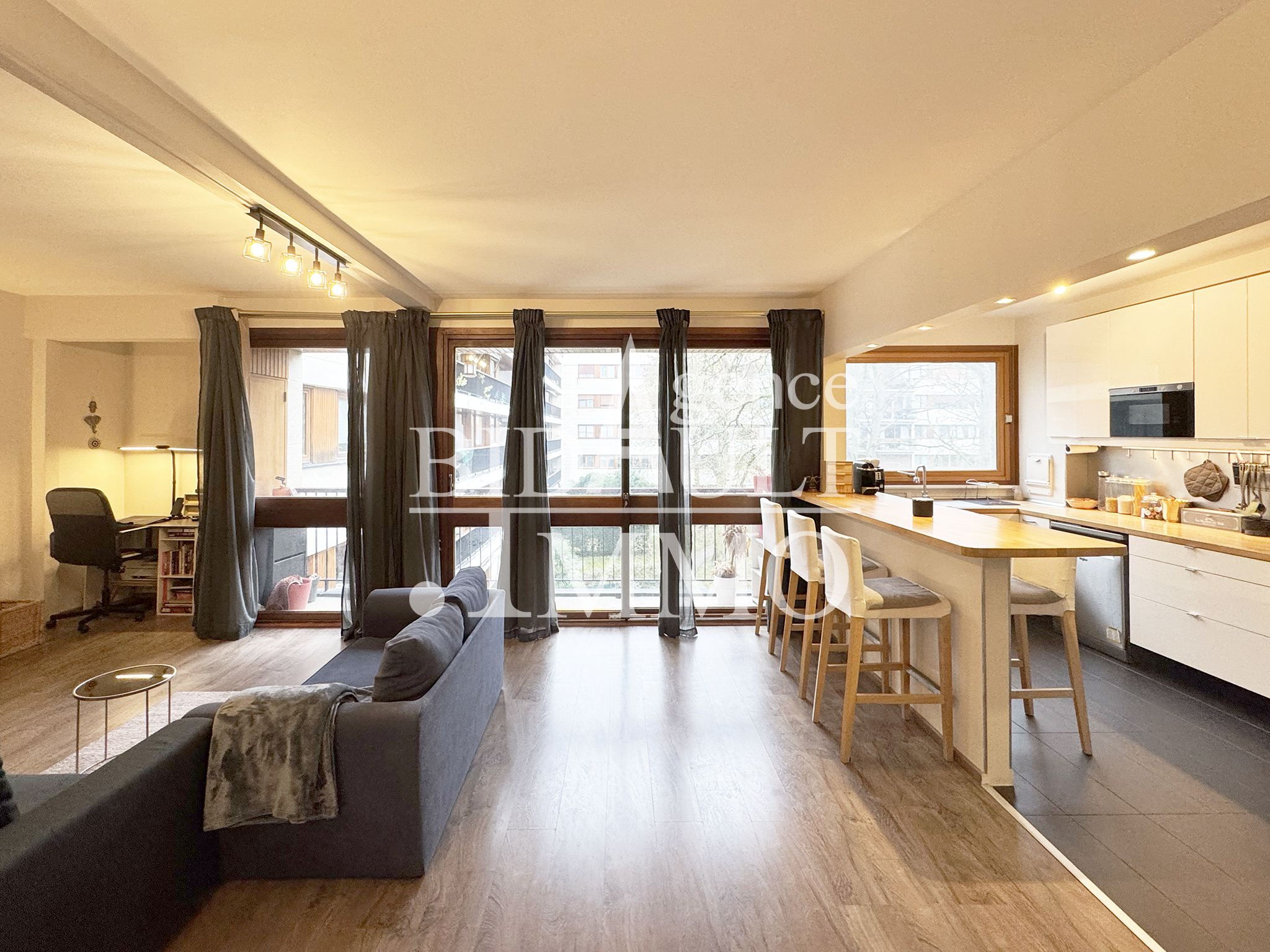 L’Agence Bidault Immobilier vous présente un bel appartement 3/4 pièces (2 chambres) rénové avec goût situé au coeur de la Résidence Élysée II à La Celle-Saint-Cloud. Situé au quatrième étage (4/6 avec ascenseur), cet appartement traversant et lumineux de 74,49m2 comprend : une entrée (3,41m2), un espace de rangements indépendant, un beau séjour / salle à manger (25,94m2) donnant sur son balcon en enfilade (Exposition SUD-EST), un espace bureau côté séjour, une cuisine ouverte équipée moderne avec son bar, 2 chambres (10,93m2-10,93m2) avec vue arborée au calme, une grande salle de bain, un wc séparé, un espace de rangements spacieux côté couloir. Pas de travaux à prévoir. Une CAVE dans le même bâtiment vient compléter ce bien. PLACE DE PARKING extérieure en supplément. Facilités d’accès A86. Arrêt de bus devant la résidence. Écoles, commerces, bus 27 (direct ligne L ou RER A) à 2 minutes. Terrains de tennis extérieurs (municipaux) et piscine extérieure chauffée au sein de la Résidence. Copropriété de 4119 lots. Pas de procédures en cours. Les charges annuelles sont de 5300 euros. Les charges comprennent l’eau froide, l’eau chaude, le gaz, le chauffage, l’entretien de l’immeuble (Fonds Travaux Loi Alur et Gros Travaux), les espaces verts, le gardien 24/24, l’usage de la piscine, la sécurité. Classe énergie D indice 207, Classe climat D indice 44. Montant moyen estimé des dépenses annuelles d’énergie pour un usage standard, établi à partir des prix de l’énergie de l’année 2021 : entre 779€ et 1055€. Les informations sur les risques auxquels ce bien est exposé, y compris l’obligation légale de débroussaillement, sont disponibles sur le site Géorisques : http://www.georisques.gouv.fr. Pour plus d’informations et organiser une visite, contactez-nous ! Vos Projets ont une Adresse…